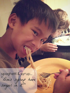 This guy is dishing up the fant-elf-isc spaghetti with syrup and pop tart crumbled topping. Oh yeah BABY! It is hard to believe now, isn't it? I'll admit, I skipped the pasta and stuck with the homemade pizza we had alongside our de-elf-ish spread. The kids really did have a lot of fun eating all this crazy, funny food though.